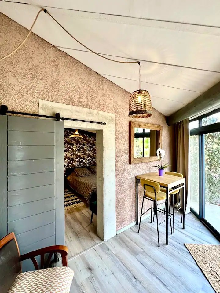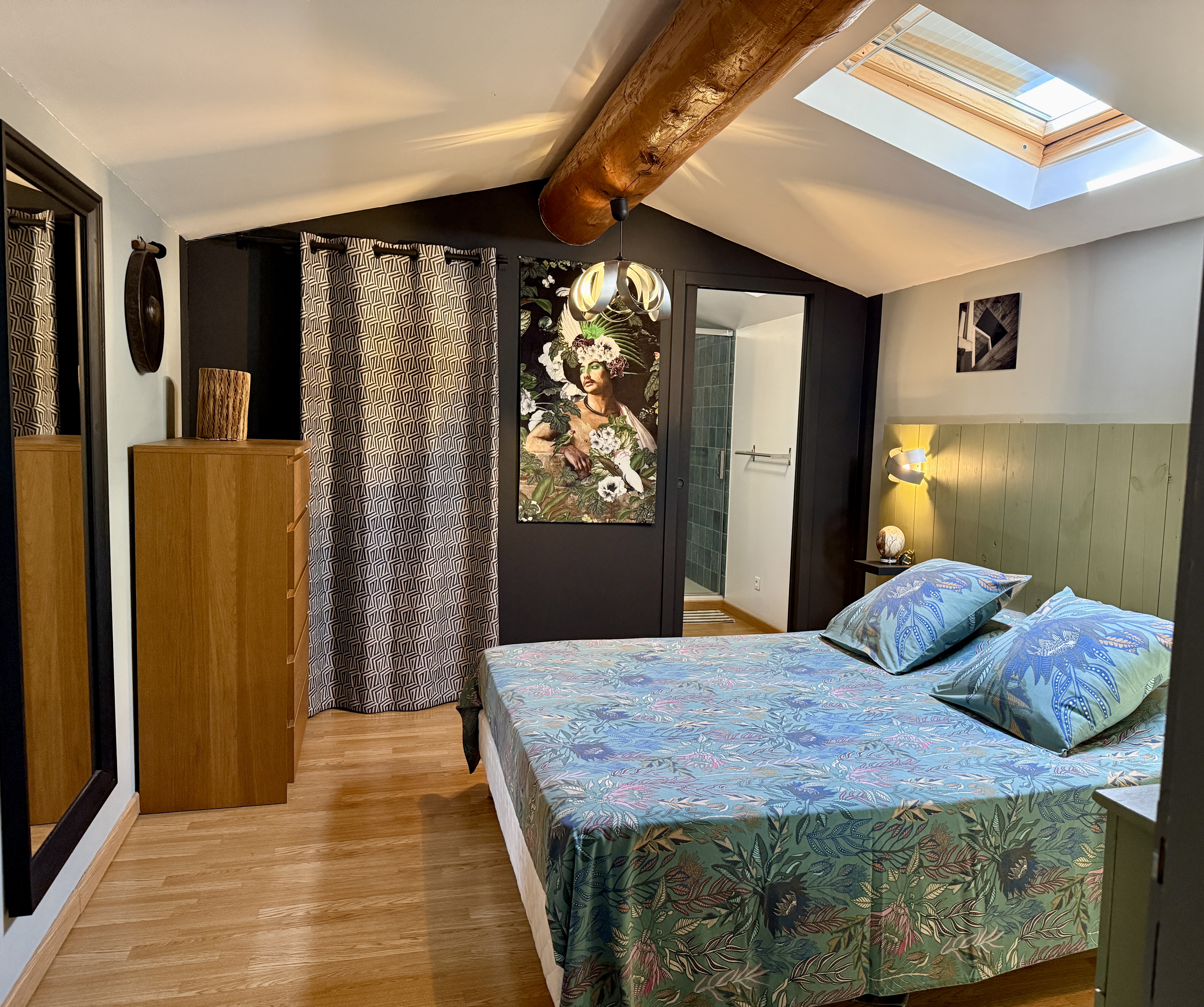Découvrez la deuxième chambre, la Junior Suite Maison de 18m2 qui comme son nom l’indique se trouve au premier étage de la maison principale. Lumineuse grâce à deux fenêtres Velux équipés de stores électrique extérieur, elle offre un confort optimal avec un lit double 160/200, une salle de bain et des WC privatifs. Un espace idéal pour un séjour convivial et pratique.